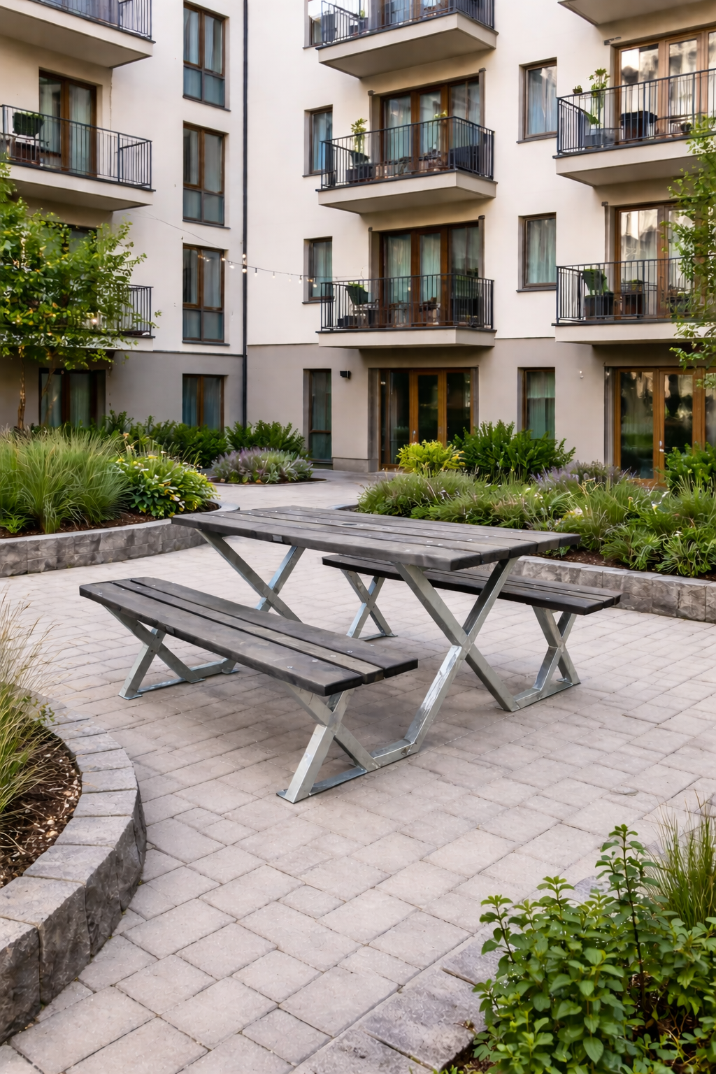En stabil och klassisk sittgrupp med plats för upp till 8 personer – utvecklad för lång hållbarhet i parker, bostadsgårdar och gemensamma utemiljöer.