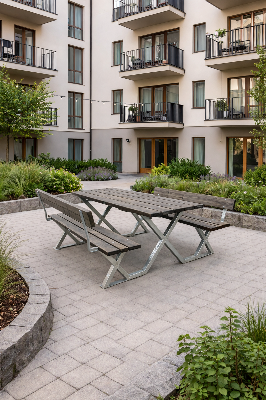 En stabil och klassisk sittgrupp med plats för upp till 8 personer – utvecklad för lång hållbarhet i parker, bostadsgårdar och gemensamma utemiljöer.