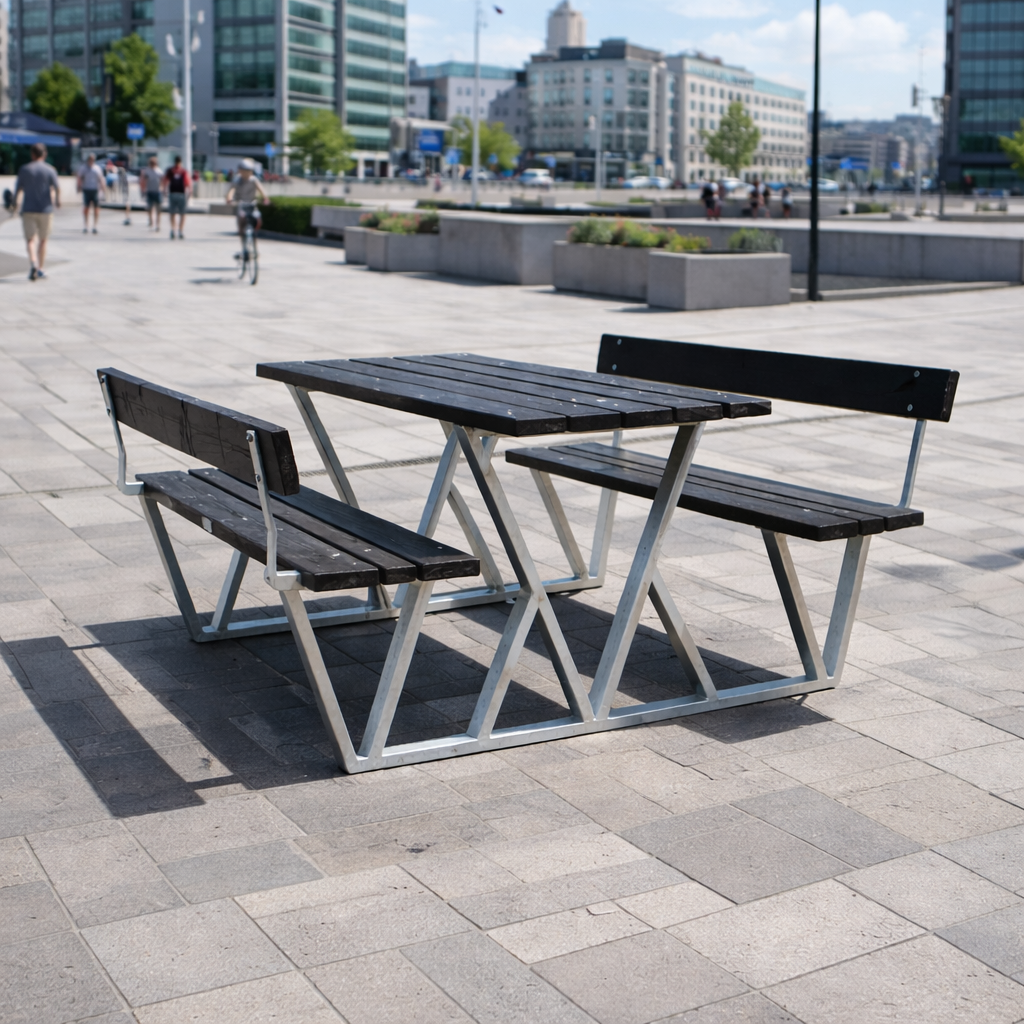 Bänkbord Wix är ett snyggt och modernt bänkbord från Eden Wood med en stabil konstruktion och generösa sittplatser för upp till 8 personer – perfekt för lunch och fika i både park- och stadsmiljö. Modellen visas här med ryggstöd men finns även att köpa utan rygg.