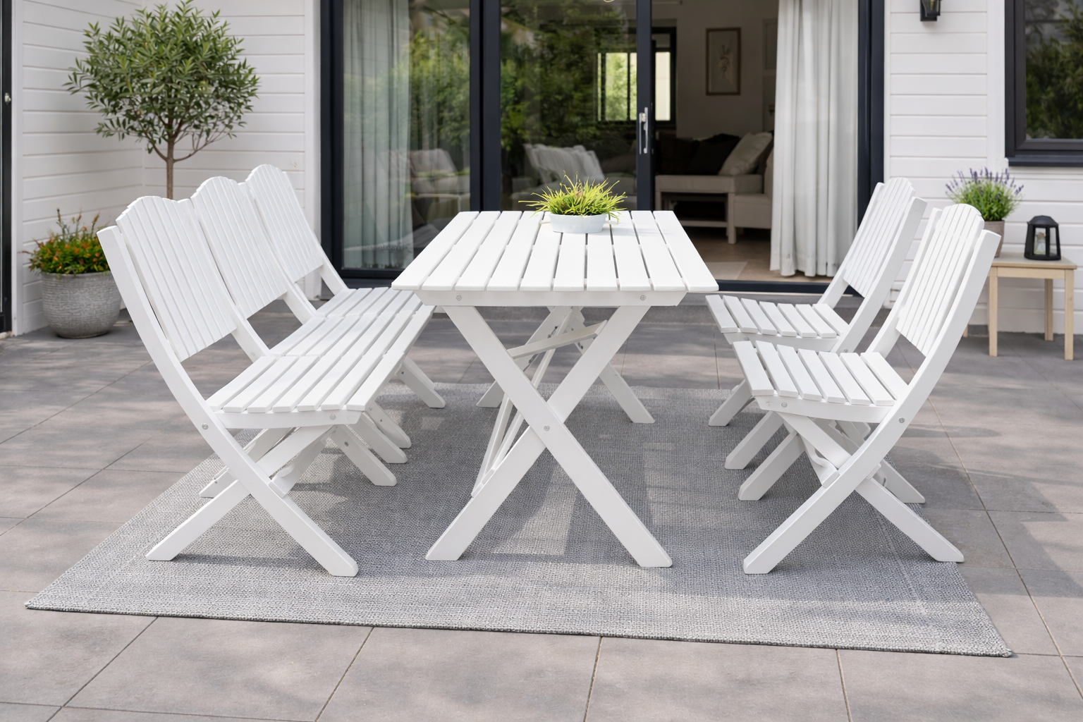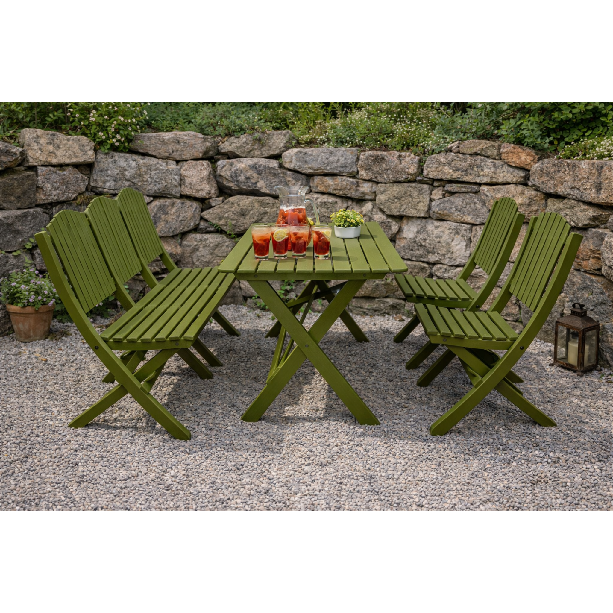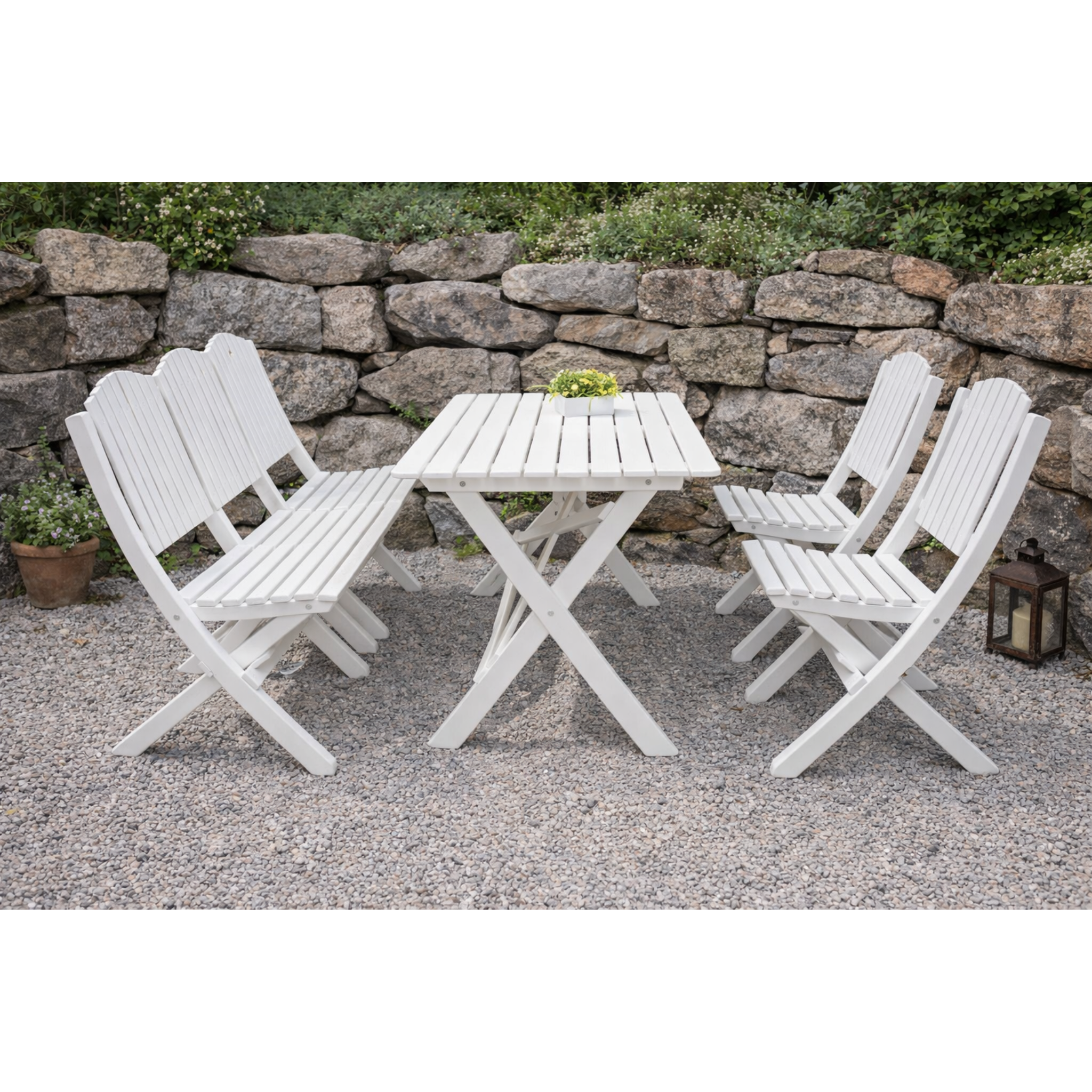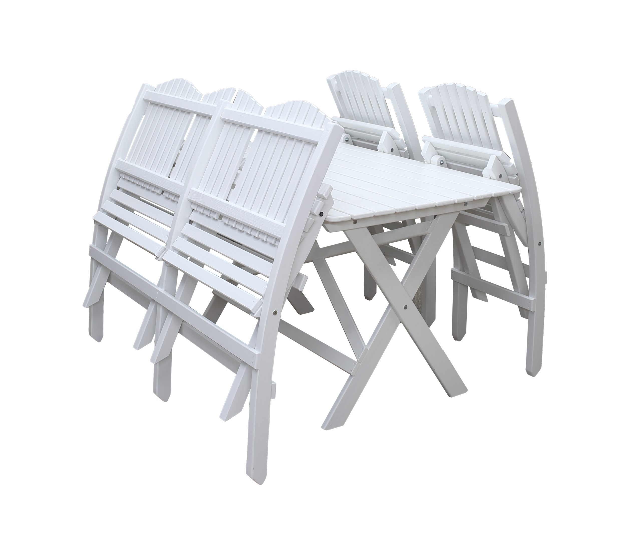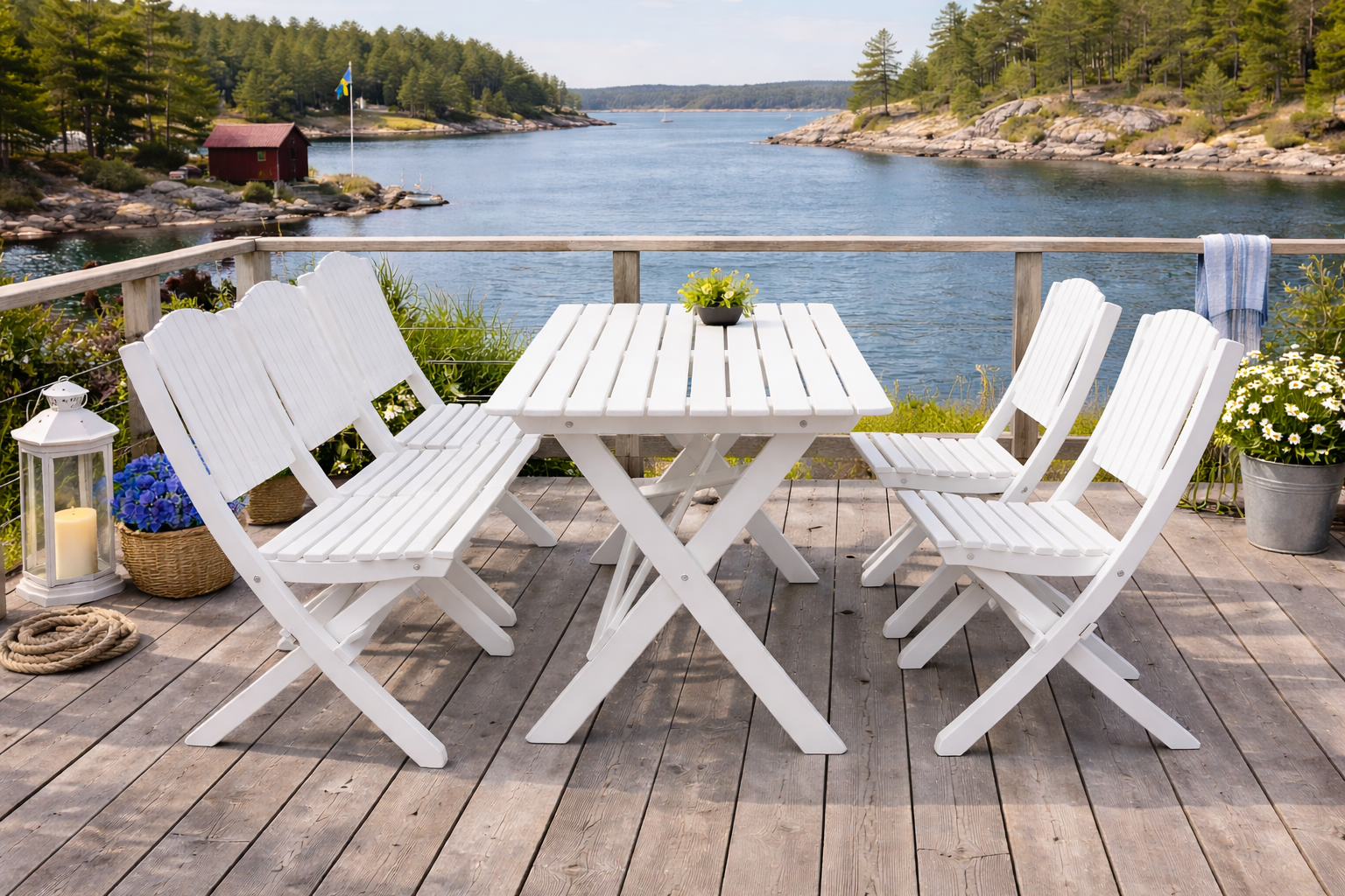 Stolar, bänk och bord är hopfällbara vilket ger enkel vinterförvaring och smidig hantering när utrymmet är begränsat. Samtliga delar tillverkas av FSC®-certifierad norrländsk kärnfuru – ett starkt och naturligt material som åldras vackert och klarar många års användning.