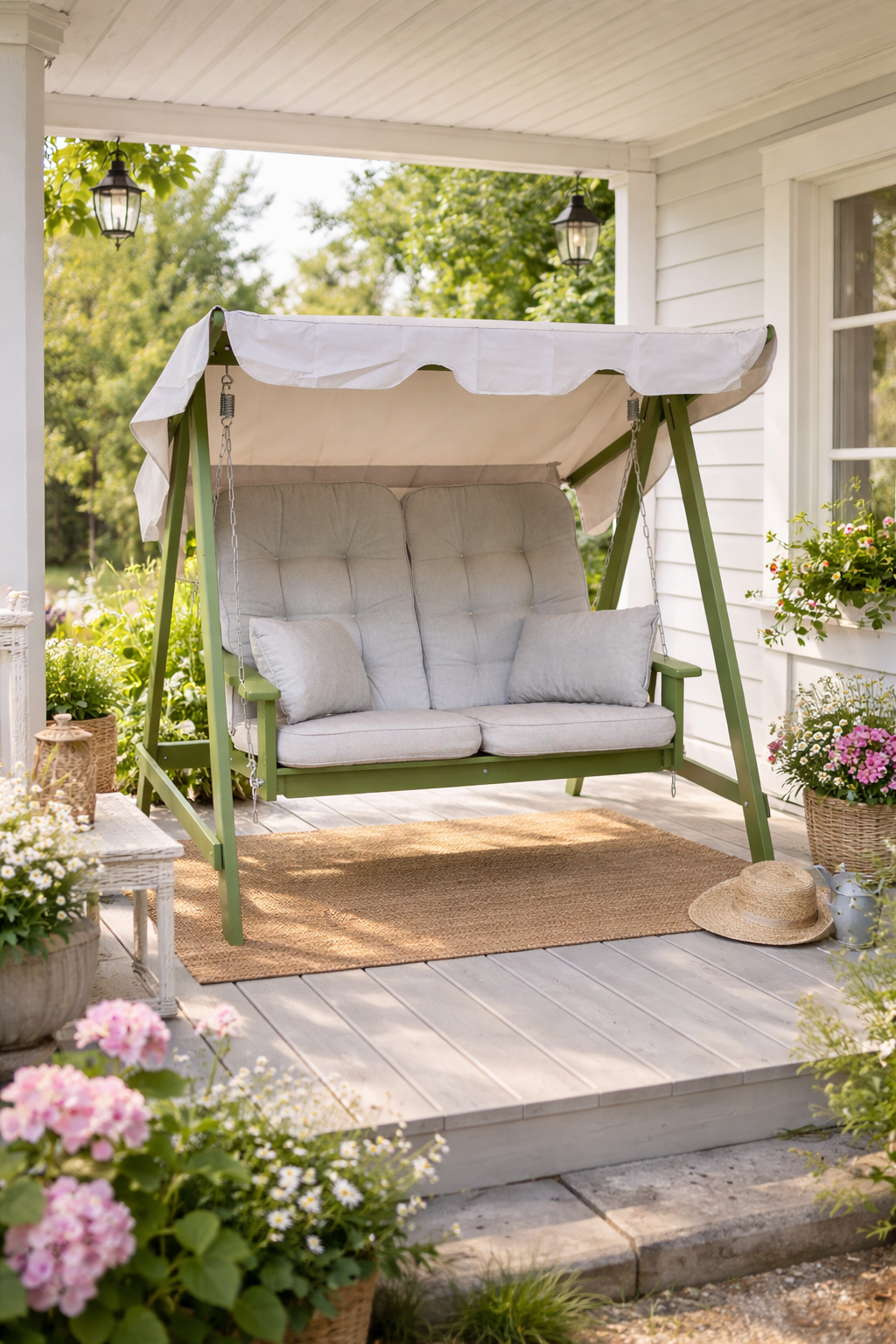 Hammock Mellby 2-sits från Eden Wood,  tillverkad i vår fabrik i Skåne. Virket är FSC®-certifierad kärnfuru från Norrland. Ytbehandling är 3 skikt akrylat utomhusfärg, Täckande grön.