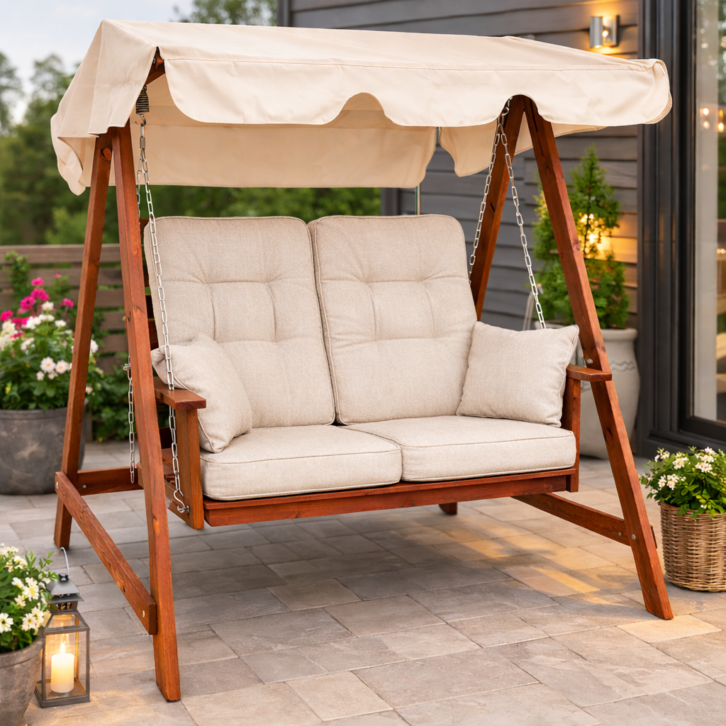 Hammock Mellby 2-sits från Eden Wood, tillverkad i vår fabrik i Skåne. Virket är FSC®-certifierad kärnfuru från Norrland. Ytbehandling är 3 skikt akrylat utomhusfärg, brunlaserad laserad