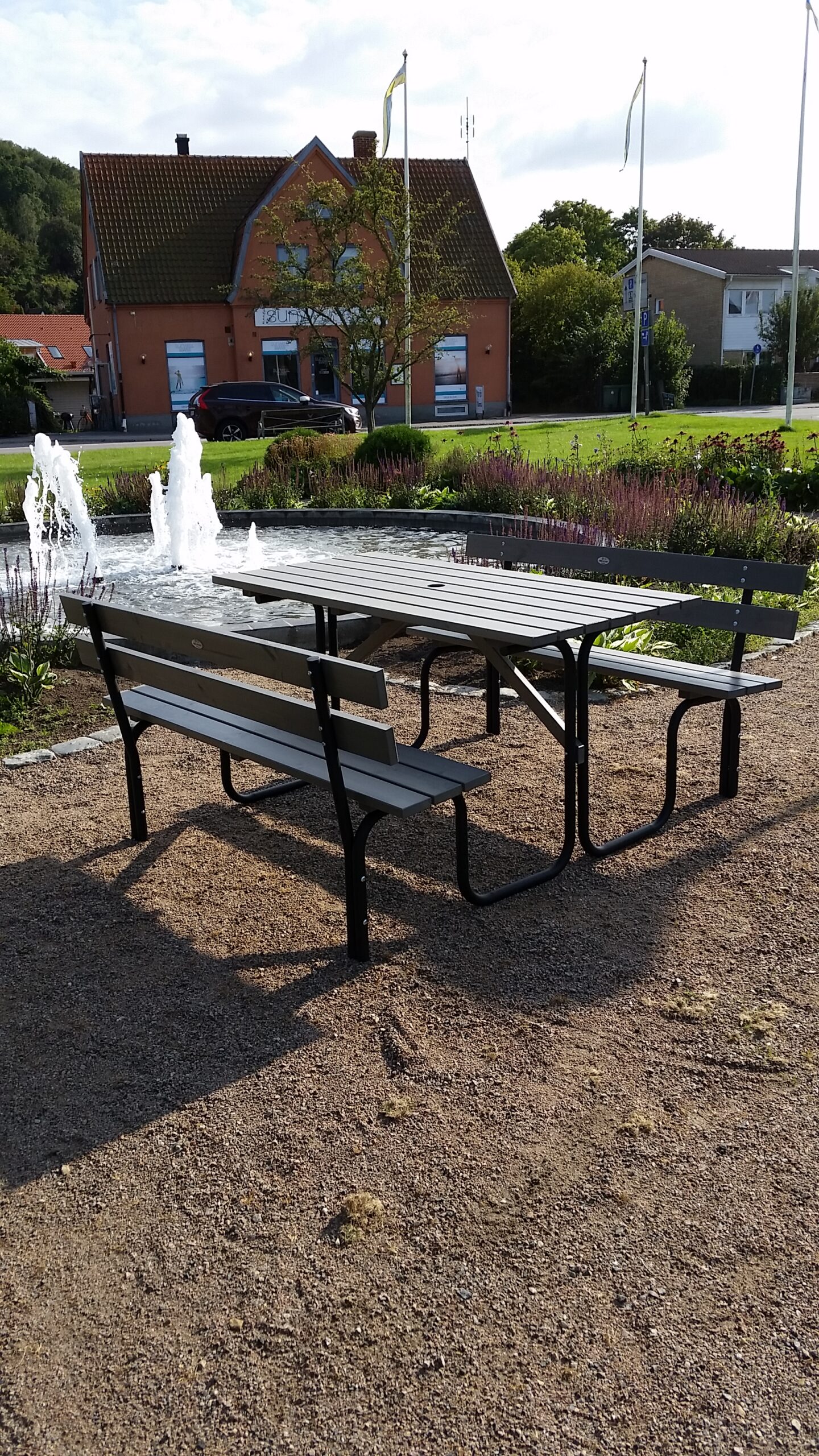 Eden Wood s Stålpicknick : bord med fasta bänkar i trä. 27 mm i svensk Norrlands furu, FSC® och tre-skikts akrylatfärg, grundfärg plus två lager täcklasyr. Bord och bänkar monteras på ett elförzinkat stålstativ, Ø32 mm, med extra stag vilket gör bordet mycket stabilt.